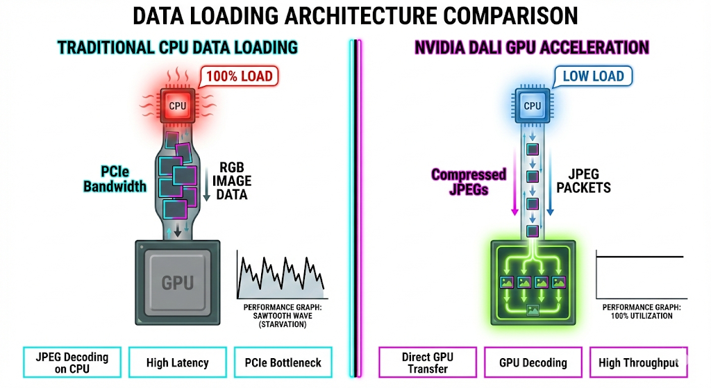 To understand this pain point, we must first clarify the complete logic of the deep learning training flow: model training's core compute relies on GPU's massive parallel computing capability; GPUs can efficiently process massive tensor operations and complete backpropagation and parameter updates. But before data reaches the GPU, it must go through a series of preprocessing operations, among which the most basic and time-consuming are image decoding and resizing. In the traditional PyTorch training flow, these critical preprocessing operations are entirely performed by the CPU, creating a contradiction between "CPU preprocessing bottleneck" and "GPU compute redundancy."