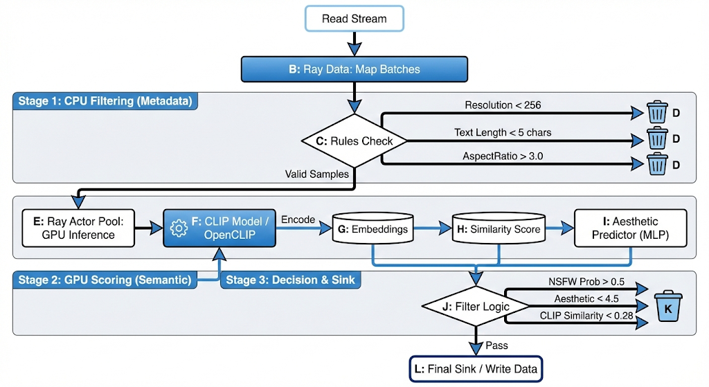 Ray Data is suitable for handling this mixed workload of both CPU-intensive (decompression, hashing, Regex) and GPU-intensive (CLIP Embedding inference) tasks. Below is a typical three-stage pipeline design: * Stage 1 (CPU): Quick filtering. Directly remove samples with insufficient resolution (<256px), too short text, non-English (if training English-only model), or abnormal aspect ratio. * Stage 2 (GPU): Deep feature extraction. Use CLIP model to generate Embeddings, and compute image-text similarity and aesthetic score based on Embeddings. * Stage 3 (CPU/Mixed): Logical judgment and deduplication. Comprehensive thresholding based on safety (NSFW), aesthetic score, and image-text relevance, plus semantic deduplication.
