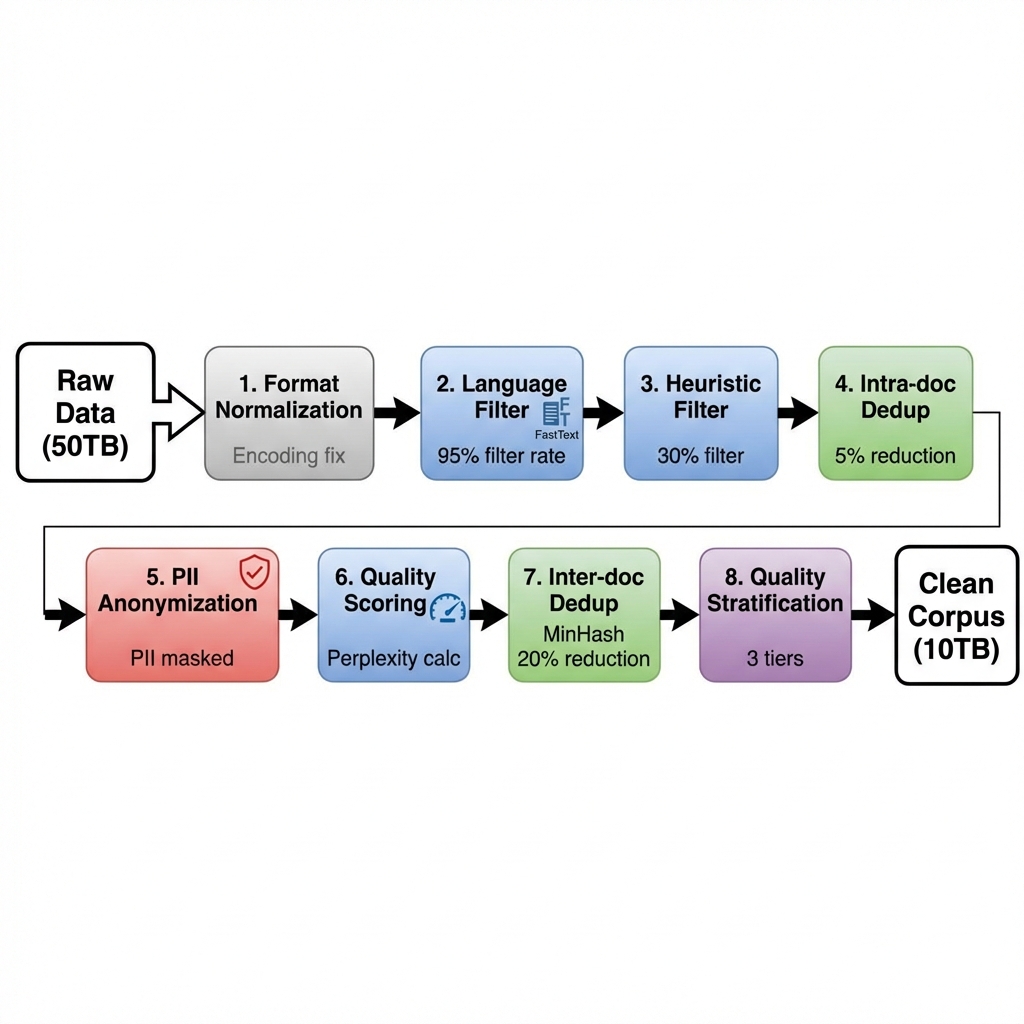 The complete cleaning pipeline connects each component, executing in the order of format standardization, language filtering, heuristic filtering, intra-document deduplication, PII cleaning, quality scoring, inter-document deduplication, and quality stratification. Continuous quality monitoring and iterative optimization are key to ensuring data quality.