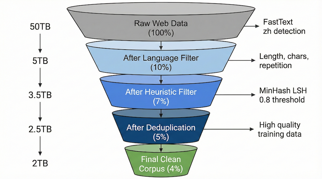 Phase 2: Language filtering. Use FastText for language detection, retain documents in target language. For mixed-language documents, classify by primary language.
