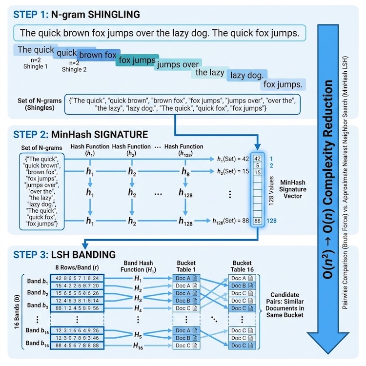 Phase 7: Inter-document deduplication. Use MinHash LSH for large-scale fuzzy deduplication to remove highly similar documents.