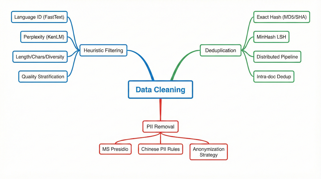 In privacy cleaning: PII detection can use Presidio or custom regex rules; anonymization strategy requires trade-offs between accuracy and information retention. Chinese PII handling requires specially designed rule sets.