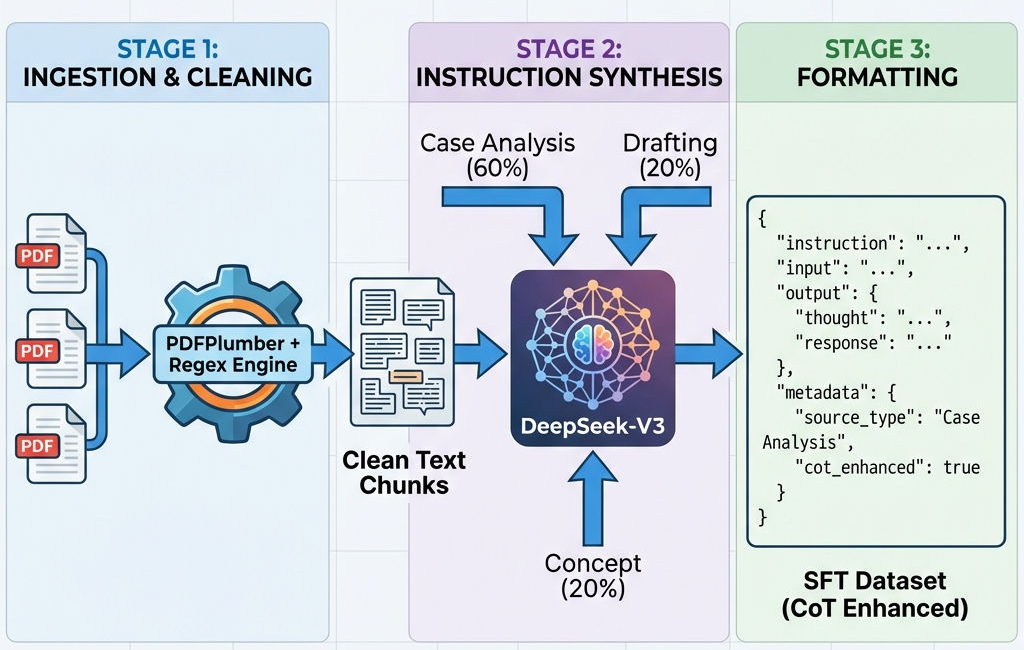 Data Distribution Analysis: - Case analysis (60%): Enhance model's complex logic handling. - Document drafting (20%): Enhance model's professional writing. - Concept explanation (20%): Consolidate foundational domain knowledge.