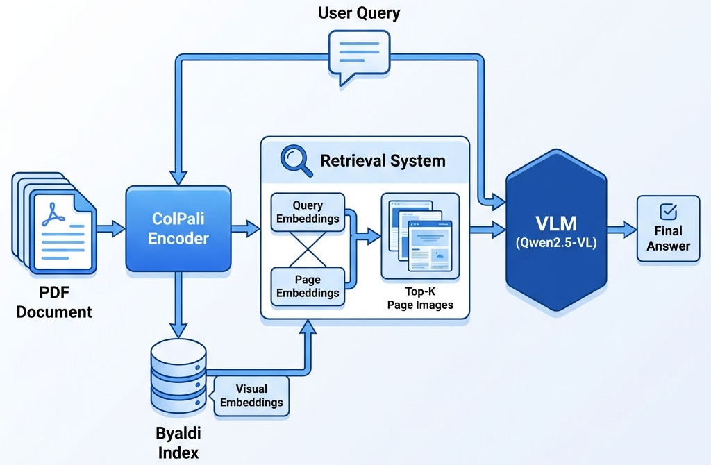This project's core concept is "ViR (Vision in Retrieval) + VLM (Vision Language Model)." We no longer force PDF to text; instead use ColPali to treat each PDF page as an image for visual encoding, directly retrieve visual features, then feed retrieved images to multimodal LLM for interpretation.